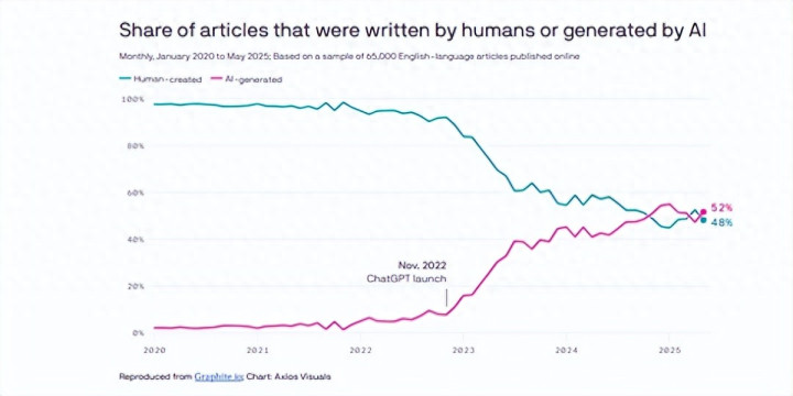 Graphite的研究来自对2020年1月至2025年5月期间发布的6.5万篇英文网络文章进行的分析,样本库来自从全球最大公开网络档案库CommonCrawl中随机抽取的网址。